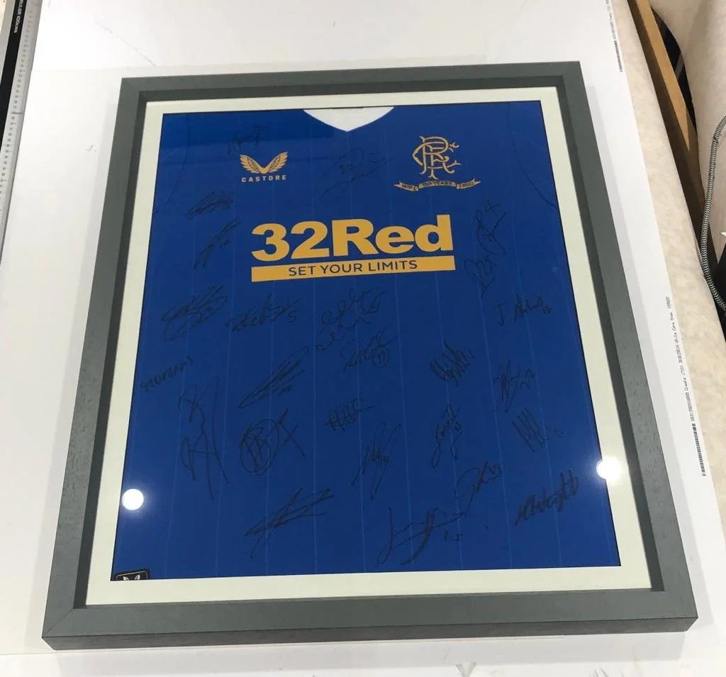 Framed shirts and memorabilia: